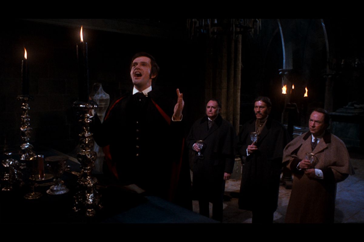 Nachdem sich die bigotten Bürger-Väter genügend an der Schwarzen Romantik berauscht haben, bringen sie den Priester des Bösen kurzerhand um, aber der wiedererstandene Dracula nimmt blutige Rache an ihnen für den Tod seines Schülers und bringt ihre Kinder gegen die Alten auf.