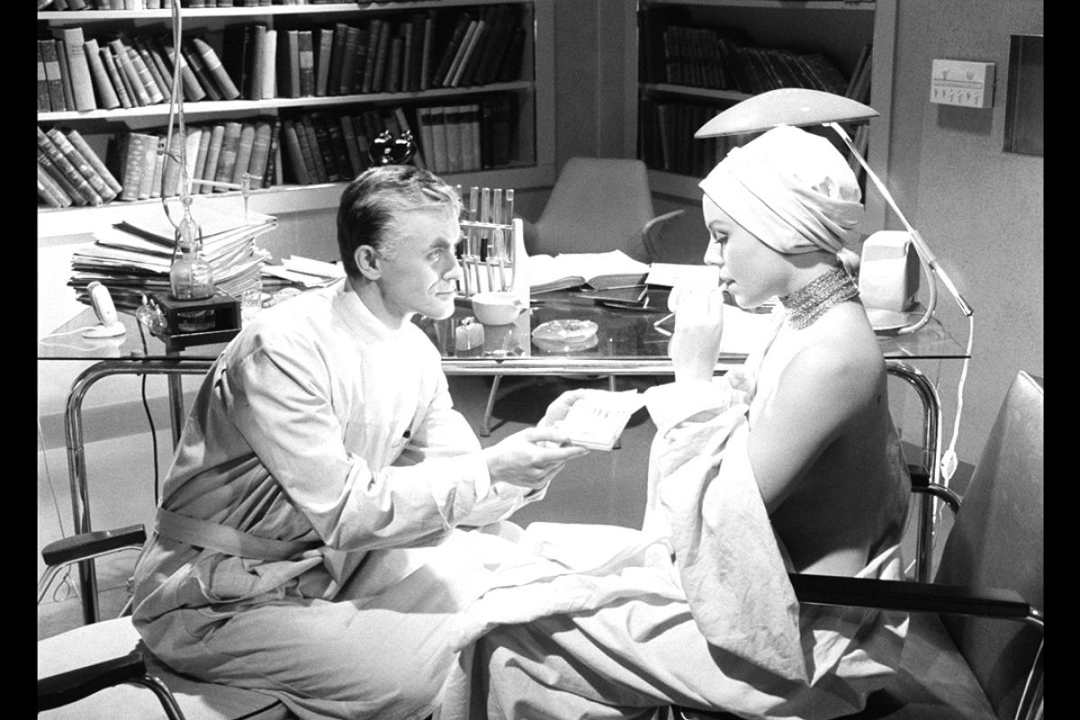 Horst Frank trennt den Kopf eines genialen Professors (Michel Simon) vom Körper, so dass er fortan ¬ in Nährflüssigkeit auf dem Labortisch von einem Apparat am Leben gehalten ¬ zusehen muss, wie sein Kollege Gott und Teufel in einer Person spielt und einer buckligen Krankenschwester den Körper einer leichtlebigen Striptease-Tänzerin gibt.